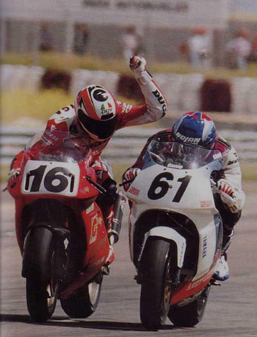 Confermo che il 16 è garriga che arrivando dalla 250-500 gp era convinto di salire sulla ducati SBK e dominare, invece soffri molto e li terminò la sua carriera di pilota. Forse in quel momento stava sfogando il suo nervoso?