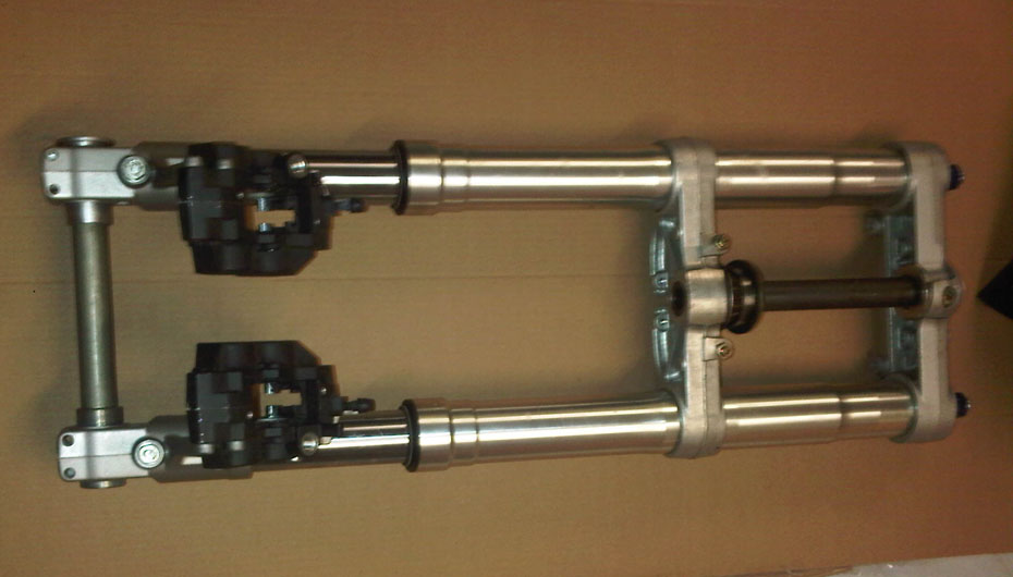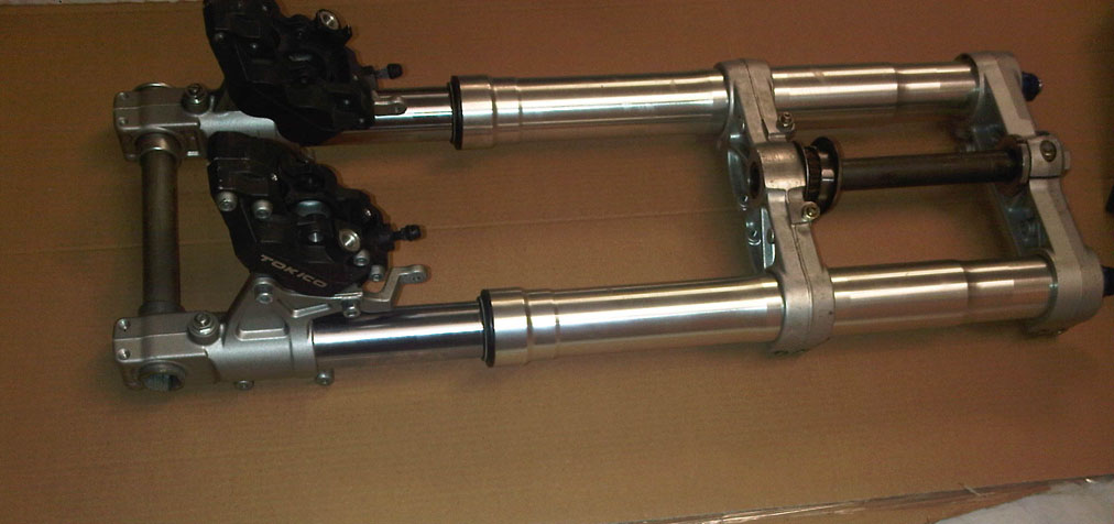 Forcelle GSXR, piastre Ducati Monster, Pinze freni complete(no pastiglie) Paragango GRSX (con un taglio, ma riparabile). Le forcelle sono praticamente nuove, consiglio giusto di sostituire l'olio perchè sono ferme da 3 anni, quindi credo sia il caso di metterlo nuovo, ma vanno provate ovviamente.