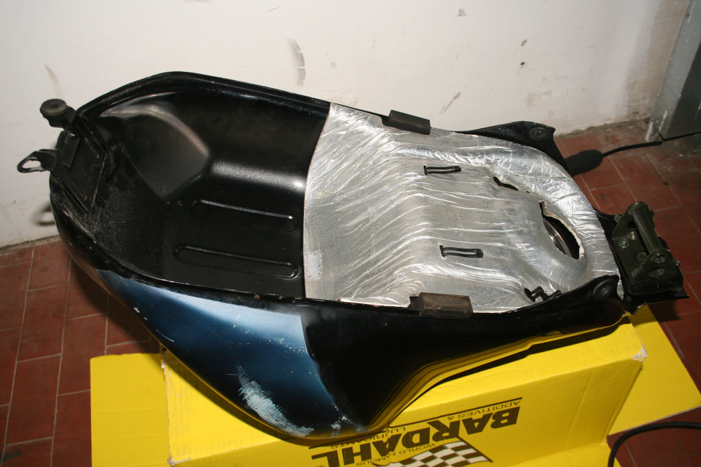condizioni: il serbatoio è caduto e riparato. è da riverniciare ma è già stato sbozzato e stuccato. come serbatoio da pista è pronto da verniciare.. per la perfezione un carrozziere dovrà invece rifinirlo. nessun segno di ruggine al suo interno.