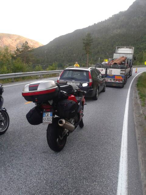 Siamo ripartiti alle5 in direzione alesund. Ora siamo fermi causa lavori x 50 minuti!!!