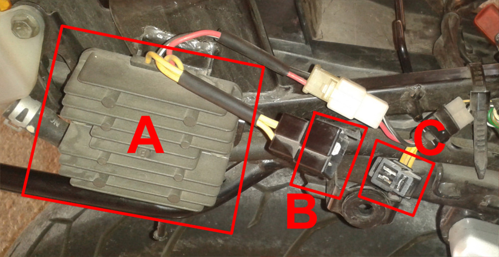 A: regolatore di tensione | B/C: connettori con tre fili gialli