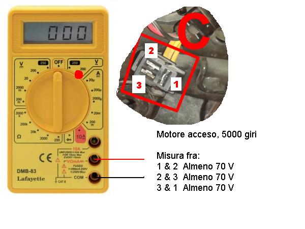 tenendo la moto a giri costanti (tipo 3000-4000) dovresti avere la stessa tensione su tutte e 3 le coppie.