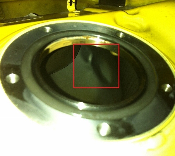 Quindi ho smontato e svuotato il serbatoio e tolta la pompa della benzina, la situazione è la seguente: come si vede dalla foto la bozza sembra essere facilmente raggiungibile, quindi vorrei provare a ribatterla dall'interno. Ma mi servirebbero un paio di consigli su come procedere: