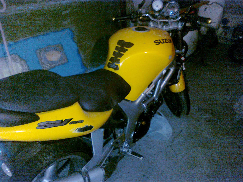 tornando a noi....come da titolo vendo la mia sv 650n del 2002 incidentata...il motore era appena taglianndato e ha 42000 km e andava ke era un'amore...considerate ke la parte anteriore è da buttare(forcelle,fanale,strumentazione,parafango,manubrio) x il resto ha il serbatoio rigato come il codone sul lato dx,e si è rotta la pedanina dx(solo la parte dove si appoggia il piede)ho la marmitta originale,copriserbatoio in pelle!!!!