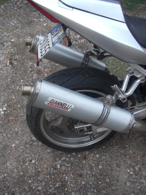 molle hyperpro davanti e dietro scarichi giannelli, pinze del cbr 600f con tubi in treccia, leva freno radiale nissin. all'attivo 36000 km, gomme al 90% michelin bimescola, tappo copri sellino (sembra monoposto), tamponi, centralina anticipo, corona rimpicciolita e centralina che recupera lo scarto al tachimetro, cupolino alzato e frecce simil carbonio.