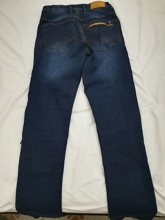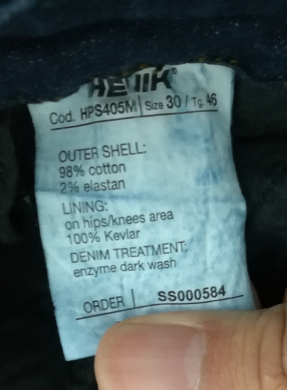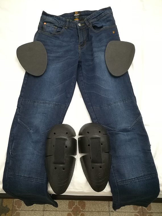 Sono jeans tecnici hevik stone, morbidi e confortevoli, sembrano quasi dei normali jeans sia come linea che come calzata (quindi se avete una 46 per i normali jeans, tranquillamente potete prendere la 46 di questi), rinforzi in kevlar sulla zona delle natiche e delle ginocchia, pad morbidi sui fianchi e protezioni semirigide omologate sulle ginocchia.