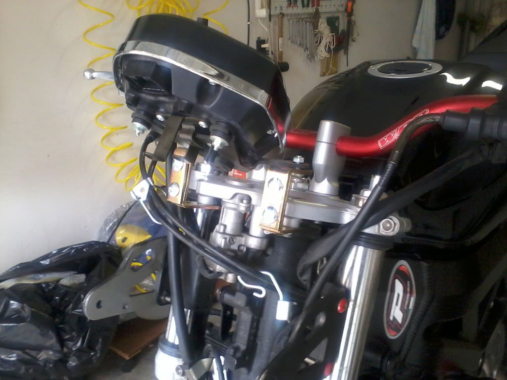 Sono riuscito ad riutillizzare le staffe laterali originali del faro SV n, "adattando" il faro hornet che ha due attacchi laterali, poco solidi e "spaiati".............