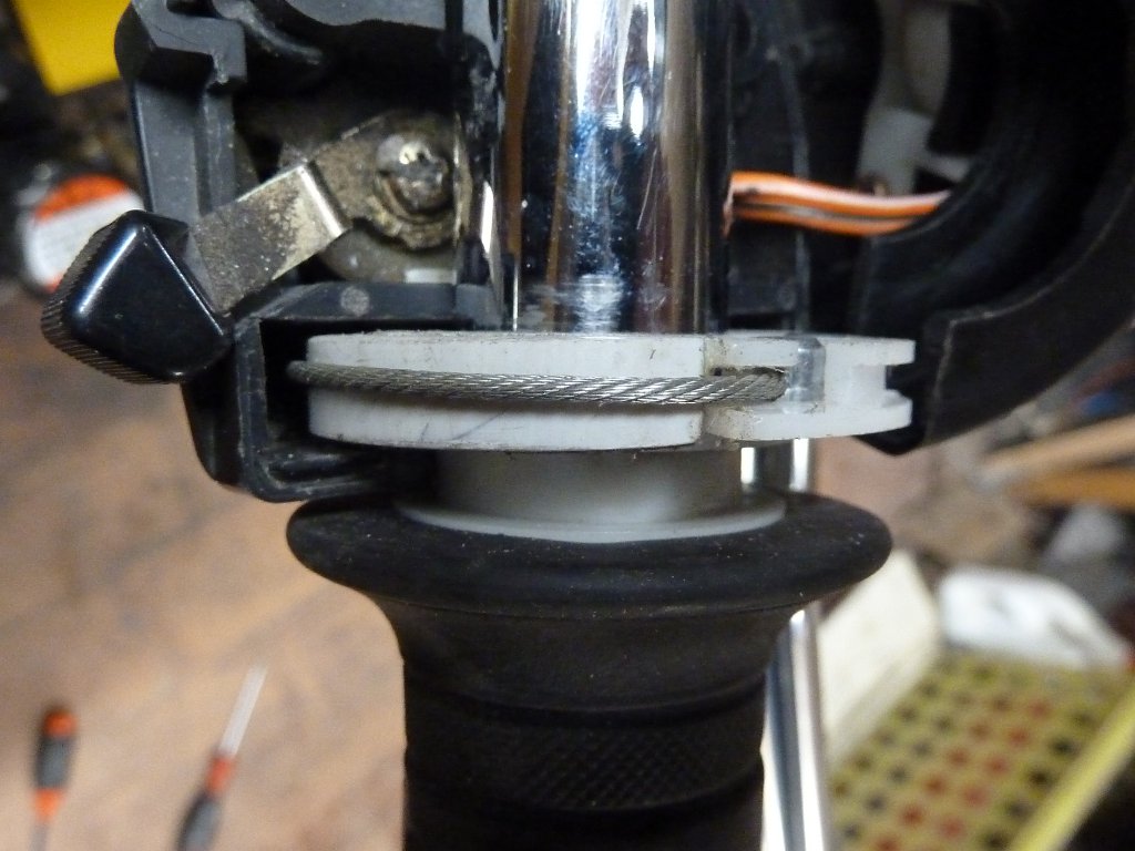 Nella foto si vede tamburo col cavo avvolto. Il cavo è quello dietro, cioè quello che chiude le farfalle, l’altro è completamente svolto e inserito nella guaina.