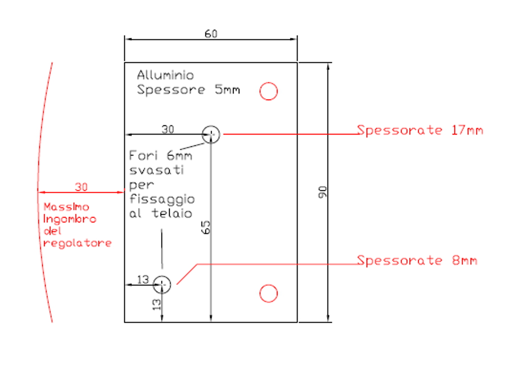 Unica nota che forse nel disegno della staffa e nelle foto non è chiaro è che i due fori di fissaggio al telaio ( quelli neri nel disegno ) vanno svasati per permettere alle teste svasate delle viti di non sporgere siccome rimangono sotto al regolatore.