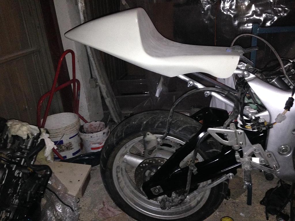 Alla fine ho dovuto modificare la parte frontale perchè c'era il rischio che andasse a interferire con l'ammortizzatore. Di seguito le foto dopo la prima mano di colore.