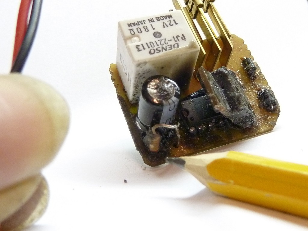 Se la corrente aumenta oltre un certo valore ( non ho misurato, l'ho scoperto incidentalmente ) come nel caso di un cortocircuito di una lampada ( per l'appunto, "l'incidente" durante le prove a banco...) il "relè" si spegne, evitando guasti all'impianto elettrico o la bruciatura del Mosfet.