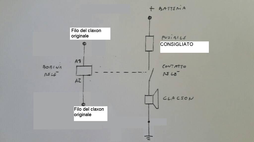 La bobina del relè in pratica va collegata al posto del claxon originale.
